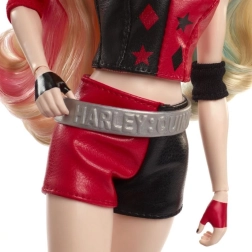 Păpușa se distinge prin prelucrarea detaliată a accesoriilor, inclusiv o curea cu inscripția 'Harley Quinn' și bâta pe care o ține pe umăr.