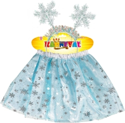 Fusta albastră cu fulgi de zăpadă strălucitori și talie din satin aduce magia iernii.