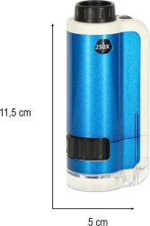 Descoperiți lumea fascinantă a microscopiei cu microscopul de buzunar pentru copii. Acest dispozitiv permite explorarea detaliată a diferitelor obiecte, cum ar fi frunzele, fibrele textile sau cristalele de sare, datorită măririi duble (100x, 250x). Microscopul este echipat cu un LED care asigură iluminare optimă.