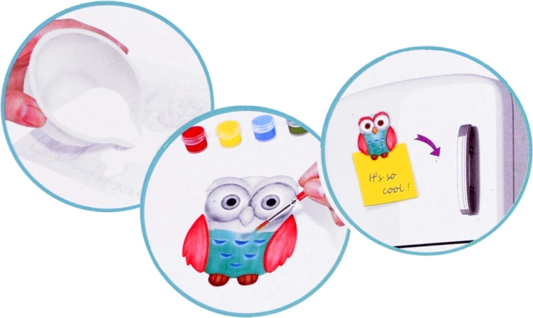 Copiii își pregătesc singuri turnarea și o decorează apoi după propriile dorințe. Setul permite crearea a până la 6 magnețele diferite.