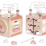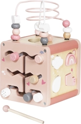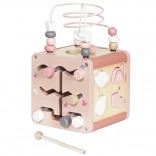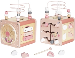 Multicub din lemn oferă numeroase activități atractive care cu siguranță vor capta și încânta copilul. Fiecare element este atent proiectat pentru a fi ușor de prins și manipulat de către cei mici. Construcția robustă din lemn asigură durabilitate pe termen lung, în timp ce grafica delicată pastel stimulează imaginația și concentrarea. Elementele mobile pe cub dezvoltă abilități manuale și îndemânare la copii.