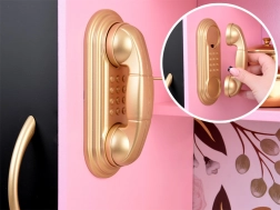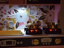 Această bucătărie se evidențiază prin designul retro cu motive florale, care se potrivește perfect într-o cameră de copii și aduce un stil unic.