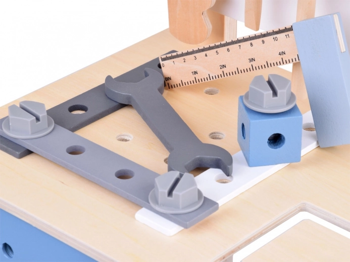 Acest banc de lucru din lemn pentru copii este conceput pentru a dezvolta îndemânarea, coordonarea și gândirea logică. Setul variat de accesorii – de la șuruburi, piulițe și lamele de îmbinare până la roți dințate, riglă, menghină, ciocănel și șurubelniță – le permite copiilor să înșurubeze, să măsoare, să fixeze și să experimenteze transmisii.