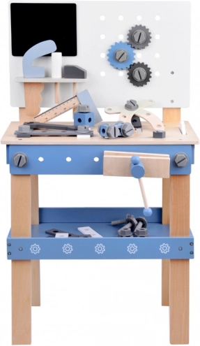 Descoperiți bancul de lucru din lemn de calitate pentru micii meșteri, care sprijină motricitatea fină, creativitatea și învățarea prin joc. Construcția stabilă din lemn masiv, marginile rotunjite și setul bogat de unelte în tonuri naturale, albastre și gri asigură ore întregi de distracție educativă și construcție creativă.