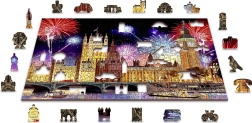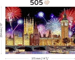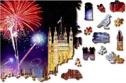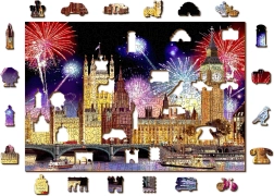 Execuția față-verso 2‑în‑1 aduce două provocări într-una: pe față asamblezi motivul color al Londrei cu artificii, iar pe verso un model repetitiv pentru asamblare după formă. Chiar și cu un număr mai mic de piese, datorită formelor variate, puzzle-ul este mai solicitant și mai distractiv. Puzzle-ul este realizat din placă HDF (3–4 mm) și livrat într-un ambalaj eco fără plastic, cu șablon inclus.