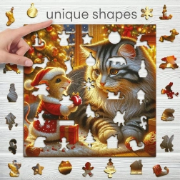 Puzzle-ul din lemn WOODEN CITY „Pisică și șoarece” oferă o asamblare neconvențională cu piese modelate original, dintre care unele au forma animalelor și pot sta singure ca mici figurine. Datorită detaliilor evidențiate cu laser și marginilor netede fără așchii, asamblarea este plăcută, iar rezultatul, vizual impresionant.