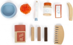 Geanta practică, cu plasă de aerisire și buzunare de depozitare, păstrează toate accesoriile laolaltă. Construcția de calitate din lemn, plastic și textile asigură durabilitate și joacă în siguranță. Setul include și o seringă cu arc, pensetă, bandaj și alte accesorii pentru o îngrijire realistă.