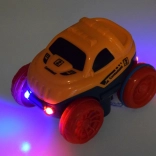 Mașinuța cu acumulator reîncărcabil și iluminare LED pornește singură la apăsarea butonului. Benzile din cauciuc de pe roțile din spate cresc tracțiunea pe pistă.