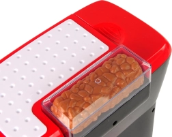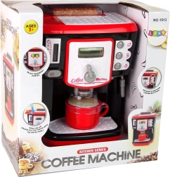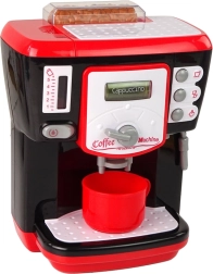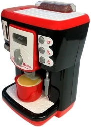 Aparatul de cafea negru-roșu este o jucărie cu adevărat interesantă. Ca aspect este stilizat după automatele moderne, astfel încât poate sta cu încredere în bucătărie lângă originalul său. Jucăria este echipată cu un buton pentru selectarea tipurilor de cafea preparată – Cappuccino, Latte și Macchiato. Pe partea stângă a aparatului se află un rezervor care, după comutarea cu un buton, face ca apa să curgă din automat! Pe partea dreaptă se află, în schimb, butoane care simulează diferite moduri de funcționare ale aparatului de cafea. Setul este, de asemenea, dotat cu o imitație de boabe de cafea în rezervor și o ceașcă ce poate fi umplută cu aparatul.