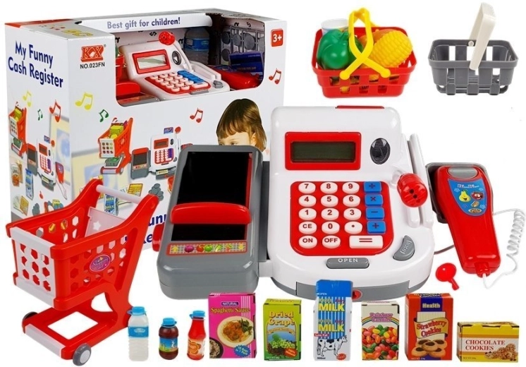 Setul conține o serie de accesorii indispensabile pentru orice vânzător. Căruciorul de cumpărături încăpător și cele două coșuri mai mici ne permit să alegem în liniște produsele. La finalul cumpărăturilor putem plăti cu bancnote și monede incluse în set. În magazinul nostru putem plăti și cu cardul, iar produsele destinate scanării le așezăm pe banda atașată casei de marcat, pe care o deplasăm cu glisorul. Microfonul și displayul ne permit să ne simțim ca o adevărată casieriță până la capăt.