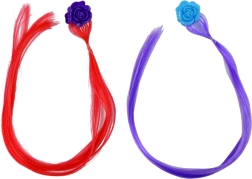 Setul include două șuvițe sintetice cu clame florale - una roșie cu trandafir violet și cealaltă violet cu trandafir albastru.