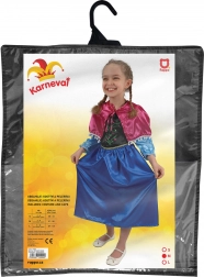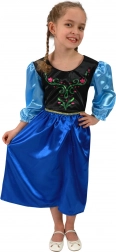 Acest costum pentru fetițe transformă orice mică domnișoară într-o prințesă a regatului iernii. Fusta albastră lucioasă și corsajul negru cu imprimeu fin creează un aspect elegant, ideal pentru carnaval, petreceri aniversare sau joaca de-a costumele acasă.