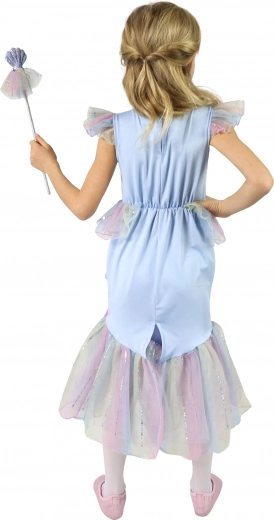 Acest costum de sirenă pentru copii transformă orice mică fashionistă într-o prințesă a adâncurilor. Materialele lucioase și paietele iridescente creează efectul de solzi marini, în timp ce volănașele delicate și culorile pastel subliniază aspectul magic. Setul include și o baghetă pentru și mai multă imaginație și joc.