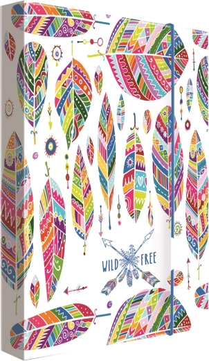 Cutie stilată și practică pentru caiete în format A4 Jumbo, cu motiv Pene. Ideală pentru elevi și studenți pentru depozitarea caietelor, foilor și accesoriilor. Datorită suprafeței laminate este rezistentă la deteriorare, menține ordinea și protejează conținutul. Închidere practică cu elastic și lățimea cotorului de 4 cm pentru suficient spațiu.