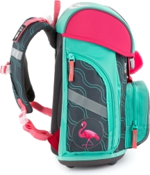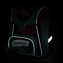 Acest ghiozdan școlar din gama Premium îmbină confortul, siguranța și designul stilat cu motiv flamingo. Spatele anatomic și întărit împreună cu căptușeala respirabilă susțin poziția corectă a corpului și confortul la purtarea zilnică. Datorită greutății reduse și bretelelor late, căptușite, ghiozdanul distribuie uniform sarcina pe umerii copilului.