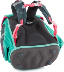 Spatele anatomic, întărit, și bretelele late, căptușite, din material respirabil, asigură o așezare corectă și o distribuire uniformă a greutății.