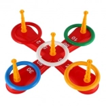 Jocul conține o bază în formă de cruce și inele viu colorate pentru aruncare distractivă.