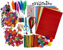 - Conținut bogat: ochi autocolanți, pene, lipici cu sclipici, cartoane, foarfece și alte accesorii