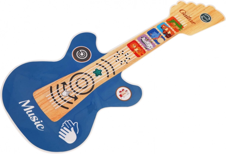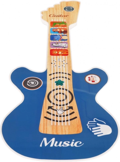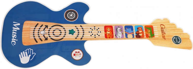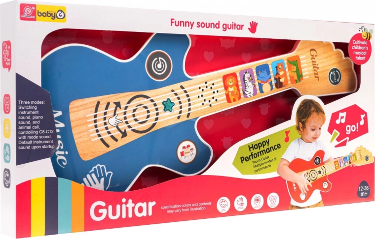 Această chitară interactivă pentru copii îmbină joaca și învățarea într-un singur produs. Datorită butoanelor tactile, copiii pot reda 11 melodii vesele, 2 acompaniamente ritmice cu tobe și aplauze, care îi răsplătesc după fiecare reprezentație. Chitara este ușoară, ergonomică și, prin culorile sale și steluța care clipește, captează imediat atenția.