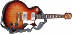 Execuție în culoare maro, cu formă de chitară electrică, curea și elemente de control pentru o experiență autentică de cântat.