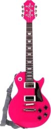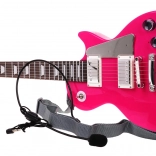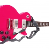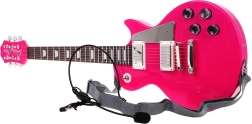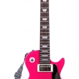 Chitara electrică roz, cu curea, stă confortabil pe corpul copiilor și, prin aspectul ei, amintește de un instrument adevărat.