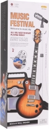 - Conținutul pachetului: chitară electrică, microfon pe stativ, amplificator, cablu jack, curea