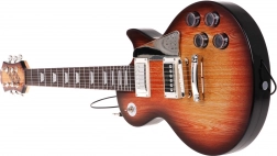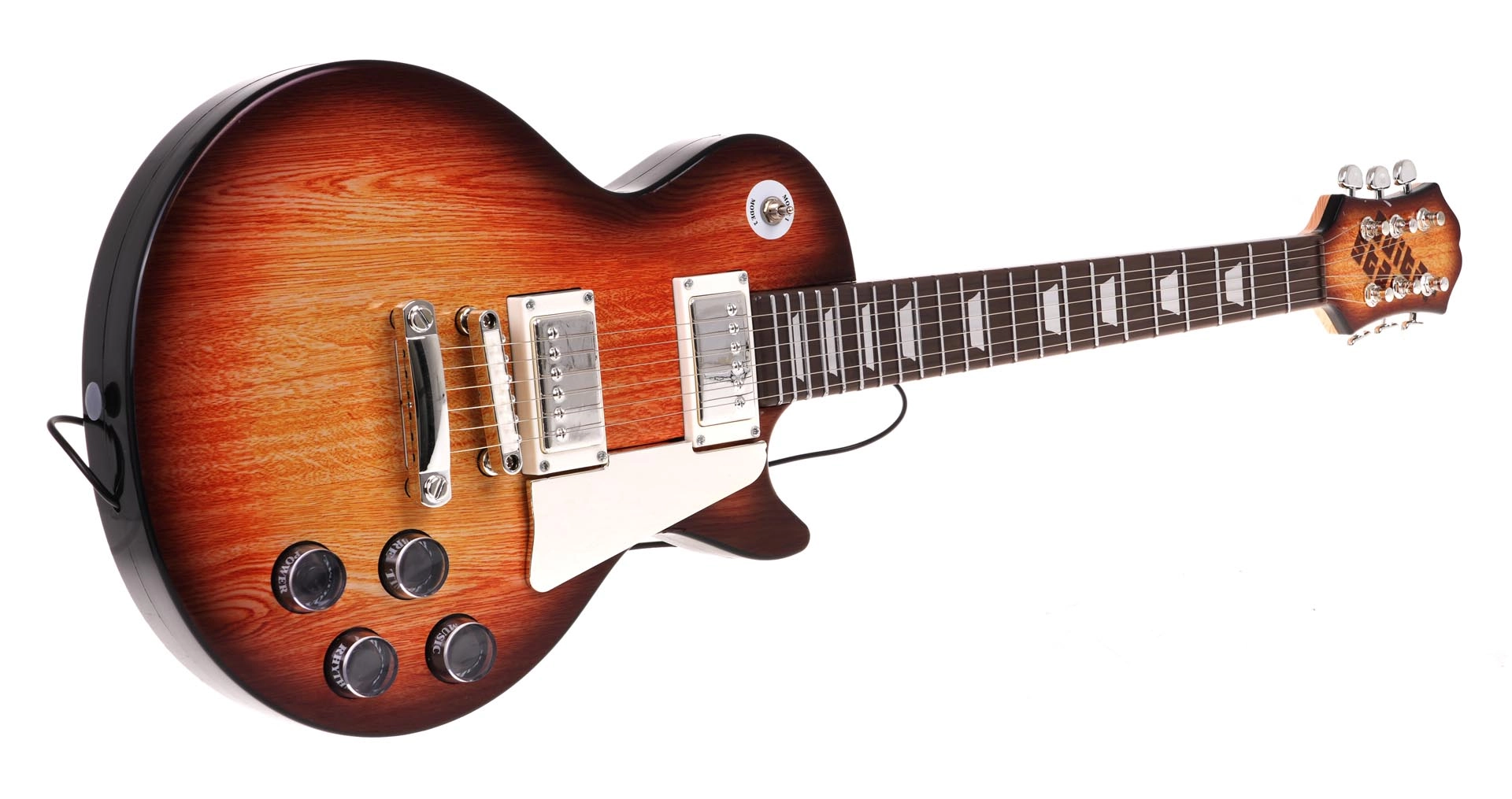 Chitara în stil maro „sunburst”, cu elemente de control și curea, îi motivează pe copii să facă muzică. Ritmurile și melodiile predefinite îi ajută la primii pași.