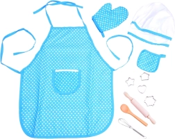 Acest set de gătit pentru copii este ideal pentru cei mici care adoră să ajute în bucătărie. Șorțul cu buzunărel, boneta cu elastic și mănușa termică protejează hainele și mâinile, în timp ce sucitorul din lemn, lingura, telul și formele metalice de decupat transformă pregătirea aluatului și a biscuiților într-o joacă. Ambalajul elegant îl face un cadou grozav pentru micii bucătari.