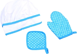 Bonetă cu elastic, șorț cu buzunar și mănușă termică cu suport care protejează hainele și mâinile, iar copiii se simt ca adevărați bucătari.