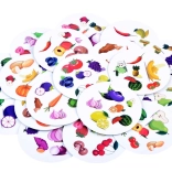 Imagini captivante cu morcovi, mazăre, lămâi sau struguri mențin atenția și ajută la recunoașterea formelor și culorilor.