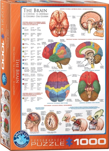 Descoperiți secretele creierului uman cu acest puzzle educativ de 1000 de piese de la marca EUROGRAPHICS. Puzzle-ul ilustrează anatomia creierului uman, funcțiile sale și operațiunile, cu descrieri în patru limbi.