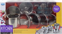 Setul de vase din inox include oală, strecurătoare, tigaie, bol, oală joasă, 2 capace, polonic pentru supă, spatulă, strecurătoare mică de mână și polonic pentru paste. Ambalat în cutie. Dimensiunile ambalajului aprox. 38x20x10 cm. Vârsta 3+