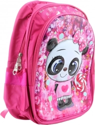 Rucsacul este decorat cu o panda drăgălașă care poartă o fundiță și ține o acadea, adăugând astfel un plus de jucăușenie și atractivitate pentru copii.