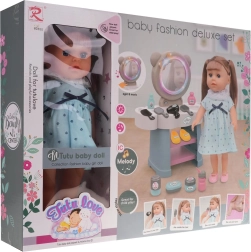 Păpușa are păr plăcut pentru pieptănat, brațe și picioare mobile și, atunci când este alimentată cu apă, emite sunete autentice de bebeluș, precum râs și plâns. Setul include diverse unelte de îngrijire și cosmetice, precum parfumuri, pieptene, perie, oglinjoară și alte accesorii magice. Păpușa este alimentată de baterii tip 3 x LR44 (incluse), în timp ce masa de toaletă necesită 4 x AA baterii (neincluse).