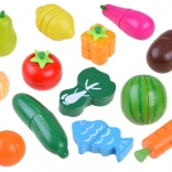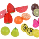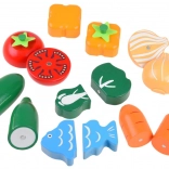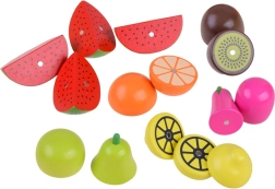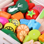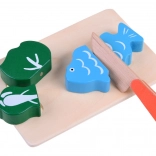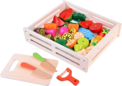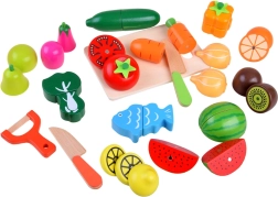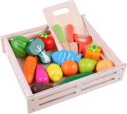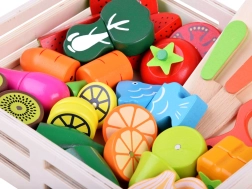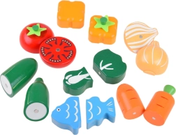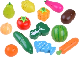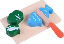 Acest set din lemn include o selecție variată de fructe, legume și pești, toate dotate cu magneți pentru o împărțire ușoară în părți. Fiecare piesă este modelată din lemn de calitate și vopsită cu culori netoxice, care asigură siguranța pentru cei mici.