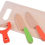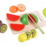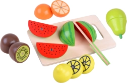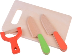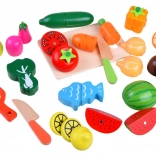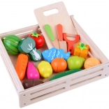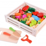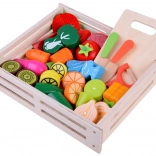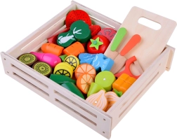 Conținutul pachetului: Cutie din lemn, placă de tăiat, cuțit cu două fețe, economizor, diferite feluri de fructe și legume, cum ar fi tomate, morcov, castravete, ardei, căpșuni, kiwi și altele.