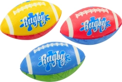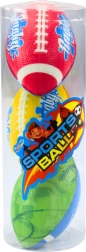Set distractiv cu trei mingi de rugby din spumă, în culori diferite, pentru jocuri sigure în grădină, pe teren sau pe plajă. Materialul moale este delicat cu copiii și oferă manipulare ușoară și sigură, culori vii pentru vizibilitate sporită și utilizare universală pentru mișcare activă.