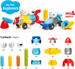 Setul SmartMax Moji primii aventurieri aduce un drum rapid și plin de bucurie în lumea jocului de construcție. Piesele în culori vii se conectează sigur și ușor datorită magneților puternici, astfel încât copiii se bucură de multe încercări reușite fără frustrare.