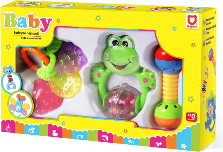 Acest set colorat de 3 piese include o zornăitoare broscuță, o halteră cu elemente zornăitoare și o jucărie de dentiție în formă de fruct. Jucăriile sunt ușoare, sigure și concepute pentru a fi ușor de apucat de către bebeluș. Sunetele emise și culorile contrastante stimulează curiozitatea și sprijină dezvoltarea simțurilor.