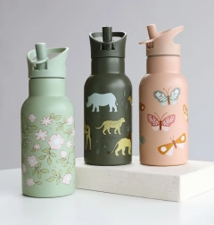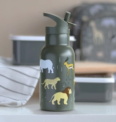Sticlă stilată pentru copii din oțel inoxidabil, cu volum de 350 ml, cu model de animale din savană. Oferă izolație cu pereți dubli, materiale rezistente și băut facil prin guriță cu pai. Ideală pentru grădiniță, școală și excursii; cu capacul filetat opțional o transformi într-un termos.