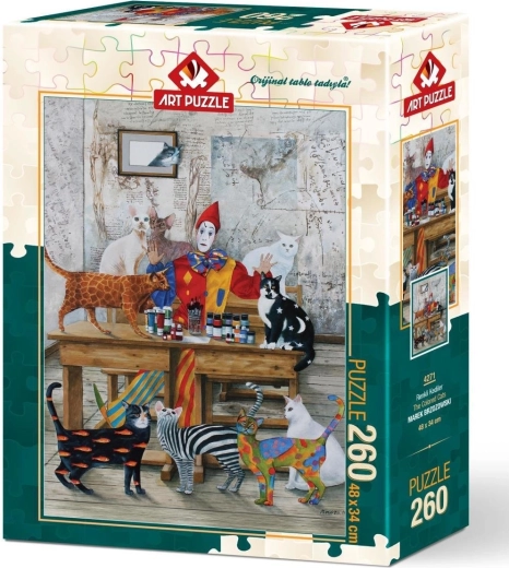 Un puzzle stilat cu motivul pisicilor colorate de la ART PUZZLE oferă 260 de piese și, după asamblare, are dimensiunea de 34 × 48 cm. Te va încânta prin decupajele precise și prin posibilitatea de a folosi serviciul de trimitere a piesei lipsă oferit de producător.