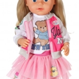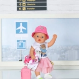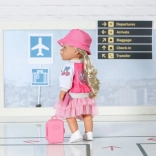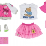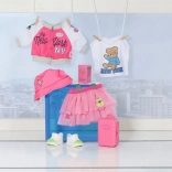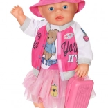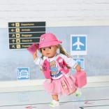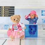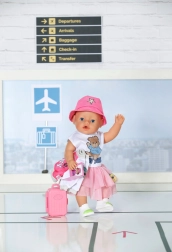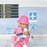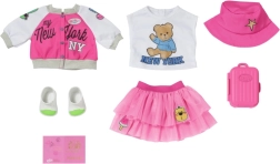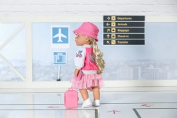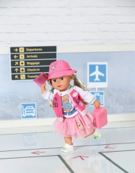 Oferă-i păpușii tale BABY BORN ținuta perfectă pentru călătorii. Acest set în nuanțe de roz îmbină confortul și stilul – de la jacheta ușoară cu motivul iconic NY și tricoul jucăuș cu ursuleț până la fusta din tiul pufos și pantofiorii comozi. Include și un troller drăgălaș și un pașaport de călătorie pentru scenarii de joacă realiste.