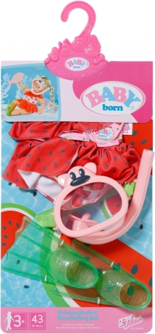 Acest set distractiv de accesorii transformă fiecare băiță a păpușii într-o mică aventură. Costumul de baie colorat cu motiv de pepene, labetele ușoare și masca de snorkeling confortabilă se potrivesc perfect păpușilor BABY born de 43 cm și stimulează imaginația și jocul creativ.