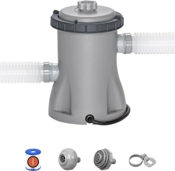 Filtru cu cartuș Flowclear cu debit de apă (puterea pompei): 1.249 l/h. Debit de apă al sistemului integrat al piscinei (debitul sistemului): 1.060 l/h. Poate fi conectat la toate piscinele cu un volum de 1.100–8.300 l. Dimensiunea conexiunii pentru furtun: 3,2 cm. Cartuș de filtrare: 58093(I). 110–120V~, 0,2A. 220–240V~, 16W. Conține: 1 x filtru cu cartuș