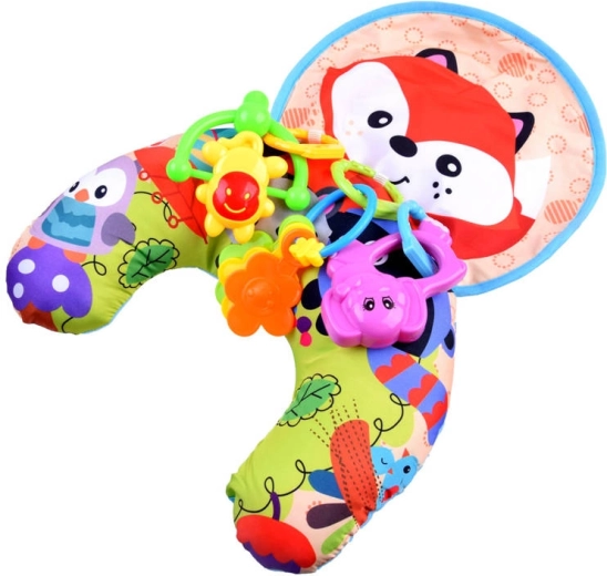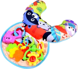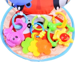 Bebelușul are în față jucării vesele care îl motivează să ridice căpușorul și să întărească mușchii spatelui.