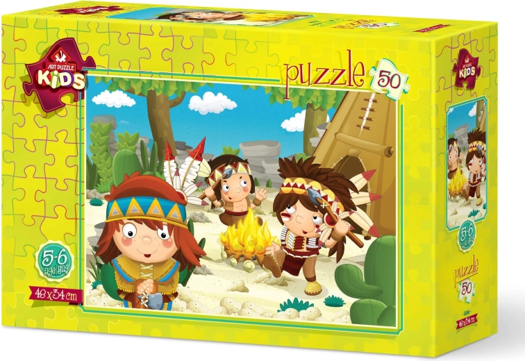 Puzzle-ul cu motivul indienilor este o alegere excelentă pentru copiii cărora le place să asambleze imagini colorate și să descopere lumi noi. Cu 50 de piese oferă o provocare plăcută, susține concentrarea și ajută la dezvoltarea gândirii logice.
