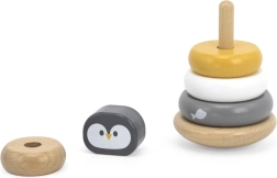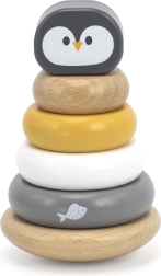 Piramida de stivuire din lemn pinguin POLARB este o jucărie clasică pentru cei mici, care îmbină joaca distractivă cu dezvoltarea timpurie a abilităților. Copiii înșiră piesele pe tija centrală, le sortează după mărime și culoare, iar în vârf așază căpșorul pinguinului. Astfel își exersează în mod natural motricitatea fină, coordonarea mână–ochi și gândirea logică.