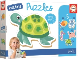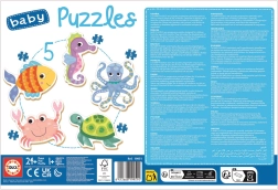 Baby puzzle EDUCA Animale acvatice 5în1 sunt concepute special pentru cei mai mici. Susțin dezvoltarea psihomotorie, coordonarea mână–ochi precum și răbdarea și gândirea logică. Imaginea asamblată măsoară aproximativ 15 × 15 cm, dimensiune ideală pentru mâini mici și primele reușite.