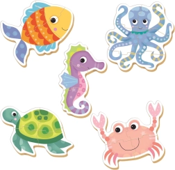 Asamblează peștișorul, caracatița, căluțul, broasca țestoasă și crabul – fiecare imagine are un număr diferit de piese, astfel încât copiii avansează natural de la mai ușor la mai complex. Piesele sunt solide, se țin bine în mână și, datorită culorilor și formelor expresive, invită la joacă.