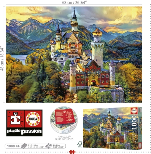 Bucurați-vă de relaxare și provocare cu un puzzle detaliat ce ilustrează emblematicul castel Neuschwanstein. Brandul Educa este renumit pentru tipărirea de calitate, piesele tăiate cu precizie și materialul plăcut, datorită căruia piesele se îmbină perfect.